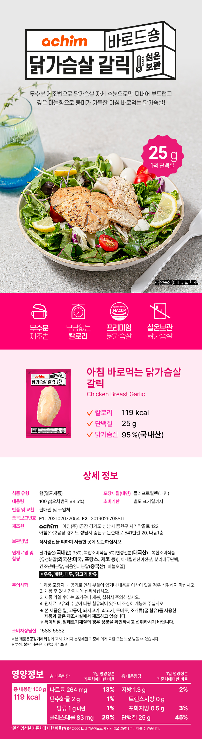 무수분 제조법으로 닭가슴살 자체 수분으로만 쪄내어 부드럽고 깊은 마늘향으로 풍미가 가득한 아침 바로먹는 닭가슴살!